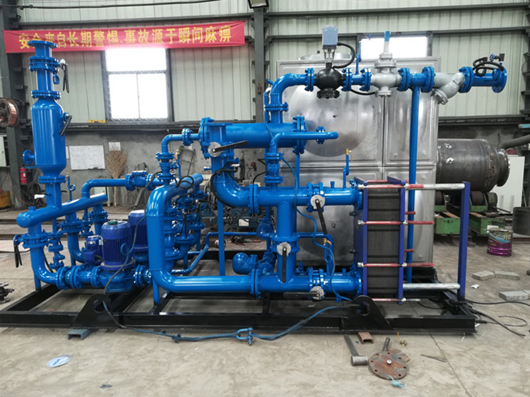 二次侧回水经过过滤除污器的过滤,过滤掉系统循环水质中的杂质,经循环水泵加压后进入板式换热器,与一次侧的热源(蒸汽或高温水)进行热量交换后,被加热的二次水经二次侧供水管道进行供热;一次侧的热源(蒸汽或高温水)经过换热器释放热量后,变成凝结水或高温水返回热源。